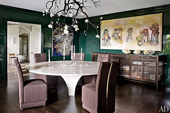Nahem encouraged his clients to be as daring in their choice of furnishings as they are in their art preferences. For the dining room he persuaded them to commission David Wiseman, the red-hot Los Angeles sculptor, to construct a one-of-a-kind hanging lamp with lights in the form of white porcelain blossoms sprouting from bronze branches. “Joe made us take risks, and he was right,” Allison says of the fixture, which seems to grow out of the ceiling. With the room’s dark-green-lacquered walls, “it’s like being in a luscious, magical forest,” she says. Nahem adds, “That piece is as much a work of art as anything on the walls,” referring to paintings by Richard Prince, Ed Ruscha, and Mark Grotjahn as well as a striking Mike Kelley composition consisting of a mass of gold-tinged beads and jewelry affixed to a panel.