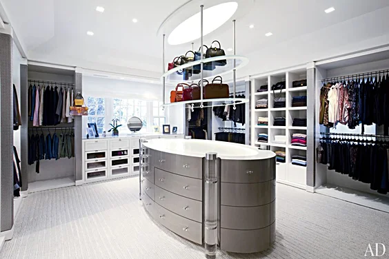 Upstairs, Nahem gutted the master suite, eliminating the sitting room to give the couple more closet space and his-and-her spa baths. In the main area, a large abstract Willem de Kooning painting overlooks a sculptural Corian bed. The white-glass-sheathed baths, meanwhile, feature custom-made resin-and-metal friezes with coordinating cabinet and counter accents by the London art studio Based Upon. And for Allison’s dressing room, Nahem consulted a stylist to discern the best way to store her clothing and accessories. “We even measured the height of her shoes,” he says. The room’s focal point is an elliptical dresser finished in silver-metallic lacquer, with glass display shelves suspended above.