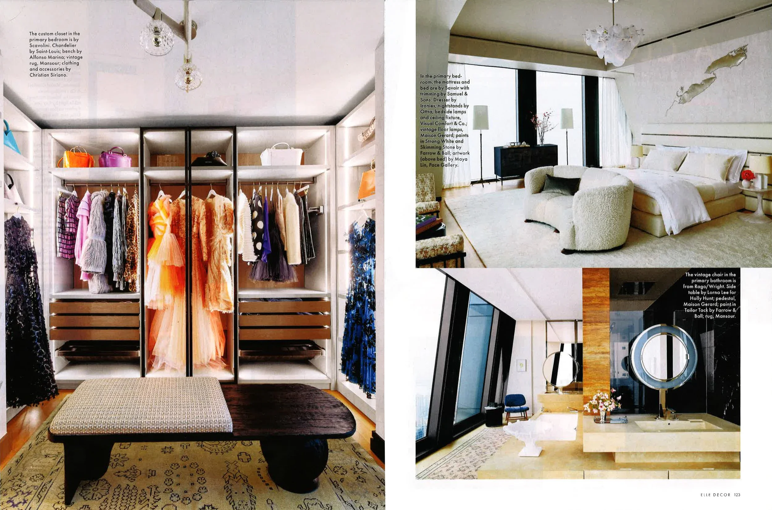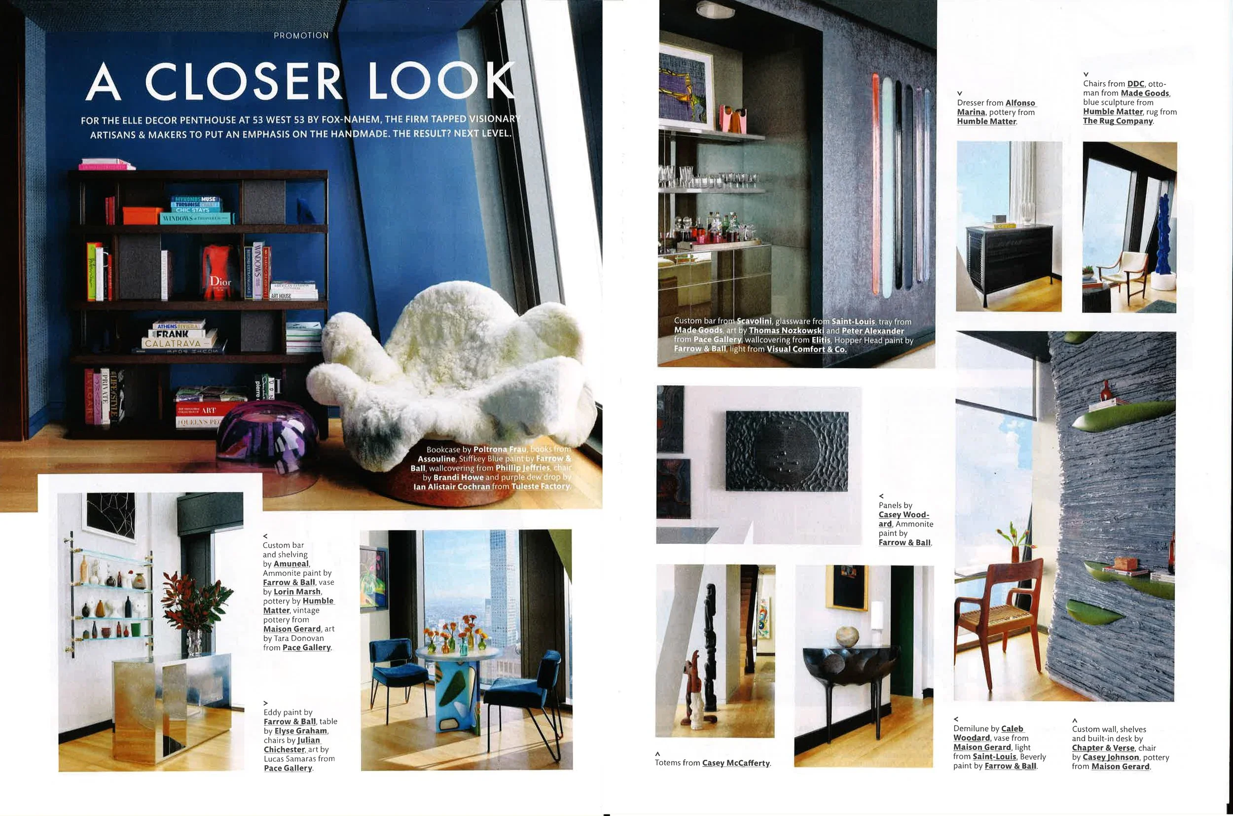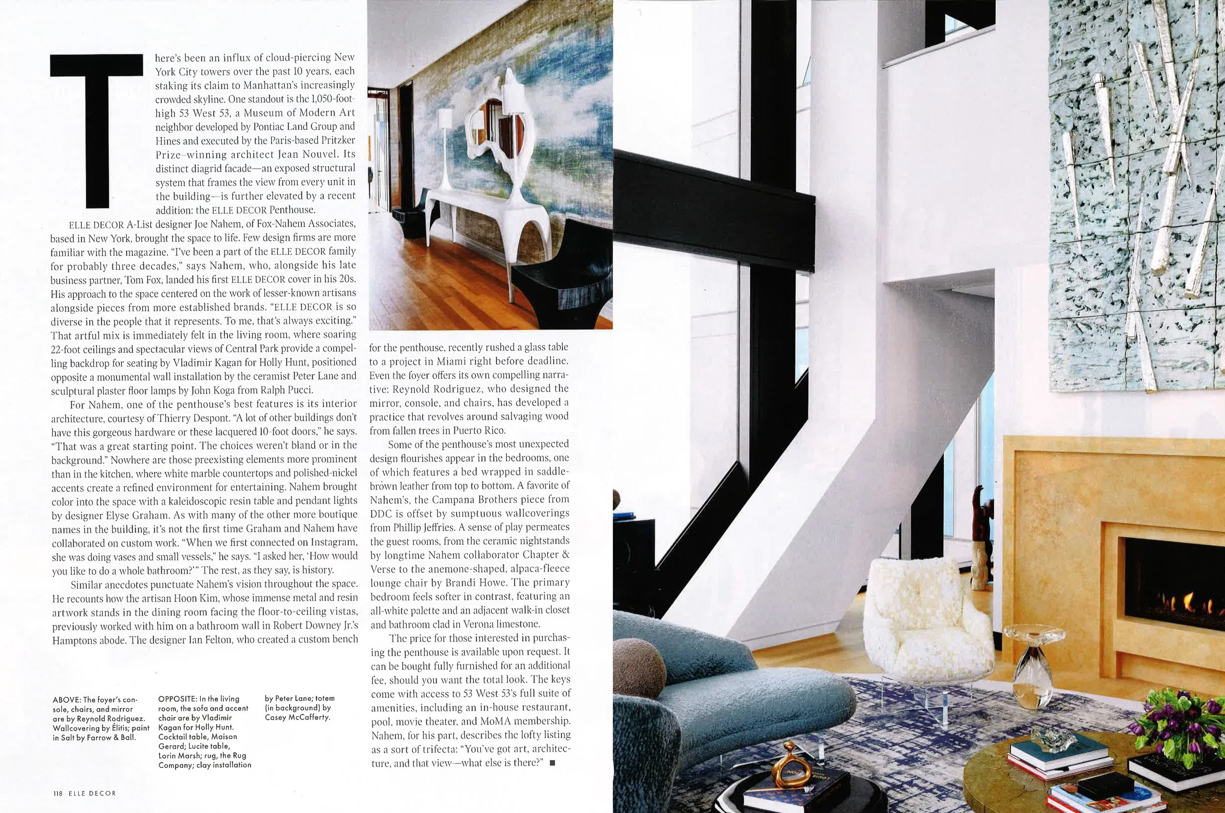 ELLE DÉCOR A-List designer Joe Nahem, of Fox-Nahem Associates, based in New York, brought the space to life. Few design firms are more familiar with the magazine. “I’ve been a part of the ELLE DÉCOR family for probably three decades,” says Nahem, who, alongside his late business partner, Tom Fox, landed his first ELLE DÉCOR cover in his 20s. His approach to the space centered on the work of lesser-known artisans alongside pieces from more established brands. “ELLE DÉCOR is so diverse in the people that it represents. To me, that’s always exciting.” That artful mix is immediately felt in the living room, where soaring 22-foot ceilings and spectacular views of Central Park provide a compelling backdrop for seating by Vladimir Kagan for Holly Hunt, positioned opposite a monumental wall installation by the ceramicist Peter Lane and sculptural plaster floor lamps by John Koga from Ralph Pucci.