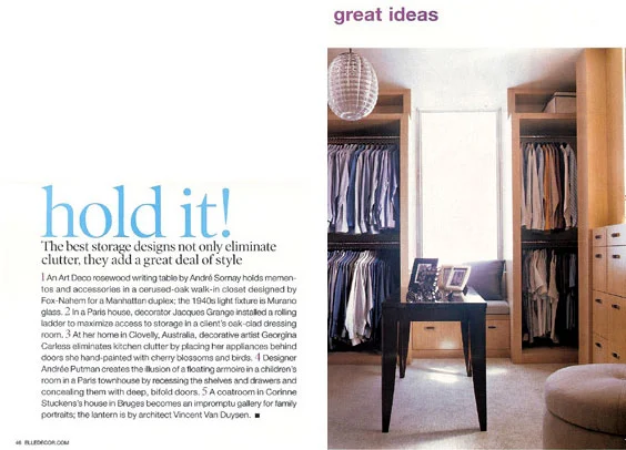 An Art Deco rosewood writing table by André Sornay holds mementos and accessories in a cerused-oak walk-in closet designed by Fox-Nahem for a Manhattan duplex; the 1940's light fixture is Murano glass.