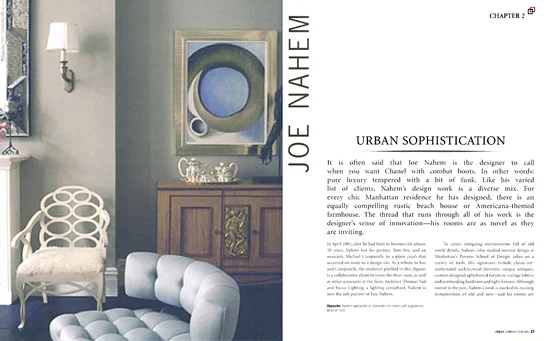 "It is often said that Joe Nahem is the designer to call when you want Chanel with combat boots. In other words: pure luxury tempered with a bit of funk. Like his varied list of clients, Nahem’s design work is a diverse mix. For every chic Manhattan residence he has designed, there is an equally compelling rustic beach house or Americana-themed farmhouse. The thread that runs through all of his work is the designer’s sense of innovation – his rooms are as novel as they are inviting.