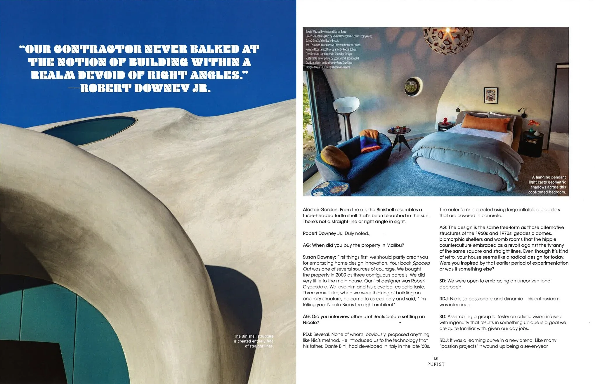 There’s a preexisting house, built in the 1970s, comfortably conventional with gray siding and multiple gables. And the Binishell: a bold, undulating experiment in architectural sustainability. Planned as a whimsical family guesthouse, it is becoming the basis for a larger lifestyle shift they are presently in the midst of Robert and Susan have kindly invited Purist to explore the future of eco-friendly home building and share some of their unique spatial experiences.