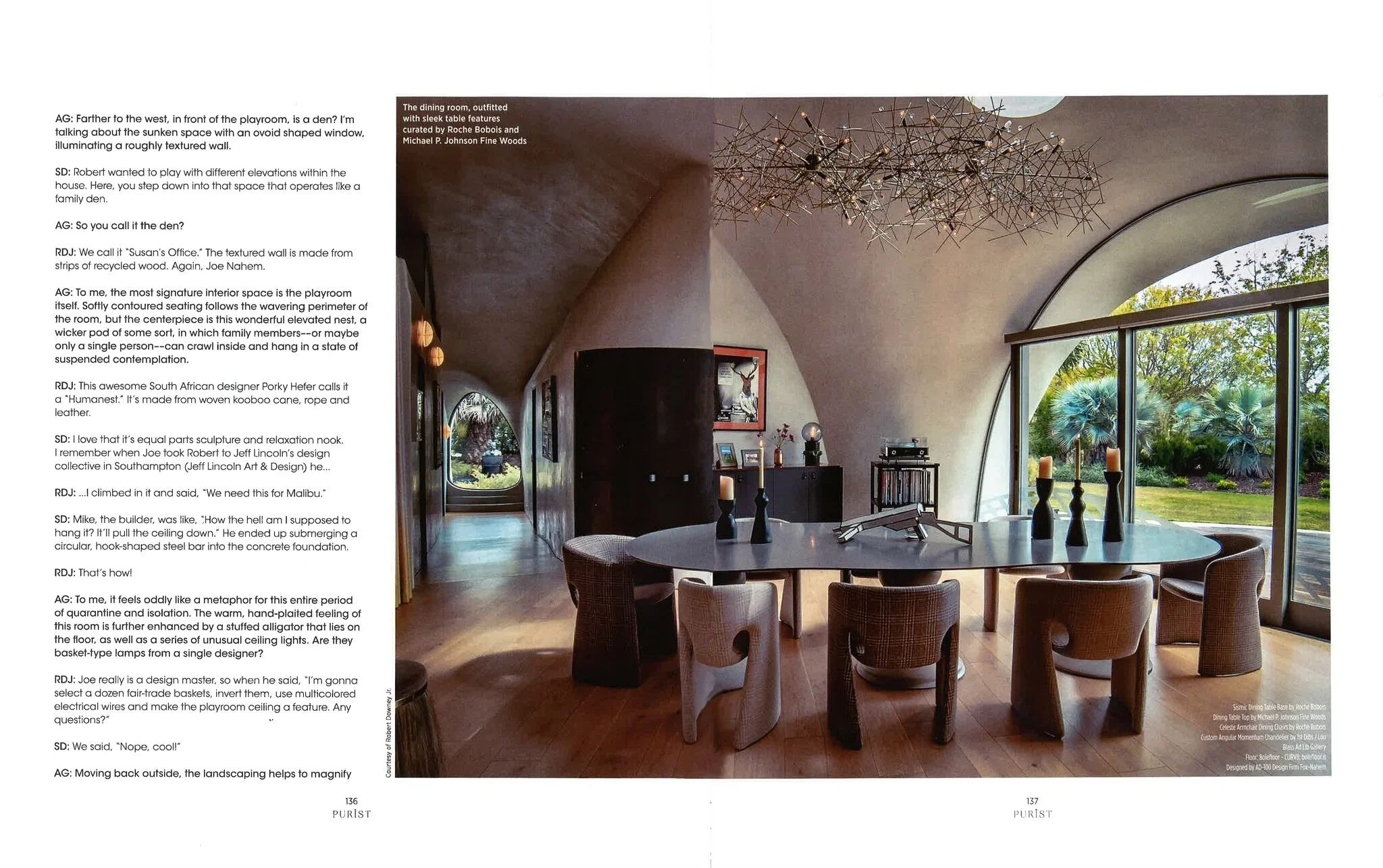 RDJ: It was a learning curve in a new arena. Like many “passion projects” it wound up being a seven-year endeavor. It was Bini’s overall vision that we backed. Mike Grosswendt (All Coast Construction) is another hero of the story: completing the shell exterior, the entirety of the interiors, getting it done within budget, while meeting every required approval of the city and coastal commission. He never balked at the notion of building within a realm devoid of right angles. Ben Goodman (Goodman Architecture) did the interiors. He and Mike set up our interior designer Joe Nahem (Fox-Nahem Design) to have maximum leeway with the elements of material, palette, taste etc.